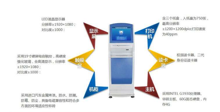 2、自助查詢(xún)打印:查詢(xún)各類(lèi)教務(wù)公告,查詢(xún)并打印學(xué)生成績(jī)、學(xué)籍證明、在讀證明等(含學(xué)生照片);采用投幣方式,或者集成校園一卡通進(jìn)行刷卡,還可集成微信支付等進(jìn)行在線(xiàn)支付,后臺(tái)可統(tǒng)一設(shè)置免費(fèi)打印次數(shù)。 系統(tǒng)可以同時(shí)支持中文和英文成績(jī)單的打印。